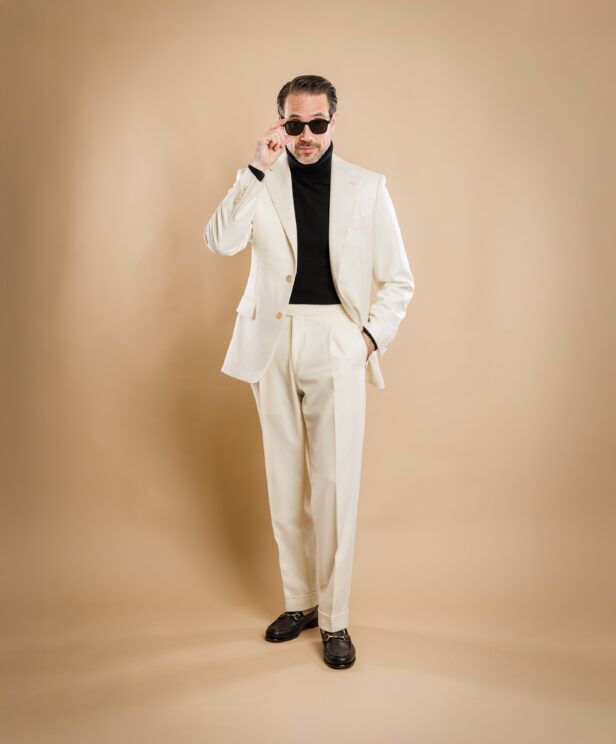 Warm, textured, and quietly confident, this ivory flannel suit hits all the notes I look for in modern tailoring. It’s a standout piece that proves lighter tones can still feel grounded and sophisticated.