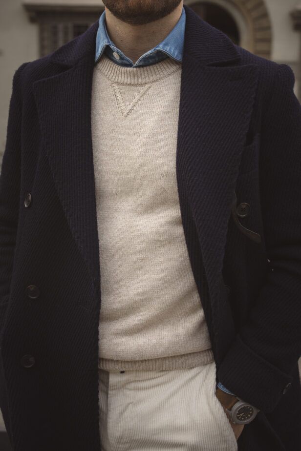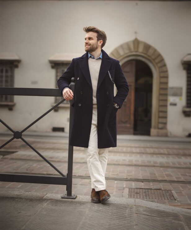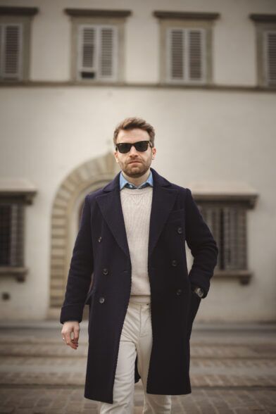 Coat: Completing the look is a navy double-breasted wool coat, a wardrobe staple that seamlessly transitions from formal to casual settings. Its versatility allows me to effortlessly pair it with a suit or create a more relaxed look.