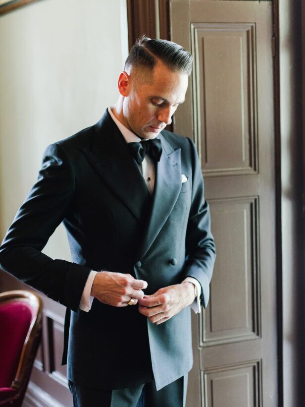 I wanted my wedding tuxedo to be super classic but also something on the special side–the former so I could continue to wear it for black tie events in the future and the latter because, hey, it’s my wedding! The classic started with the fabric–Dormeuil tonik, the gold, or should I say diamond, standard for tuxedos–and the grosgrain lapels. The special touches included making it double-breasted, going with bold 4.5-inch lapels, a cocktail cuff and a single pleat on the trousers. I’ve already written in-depth about all the finer details of this tuxedo and you can read the complete story of my final fitting here.