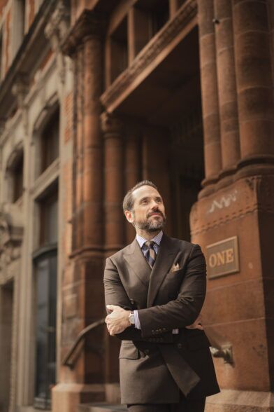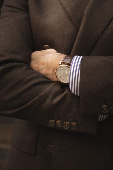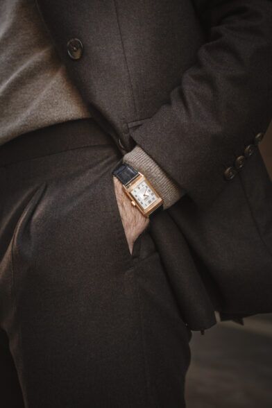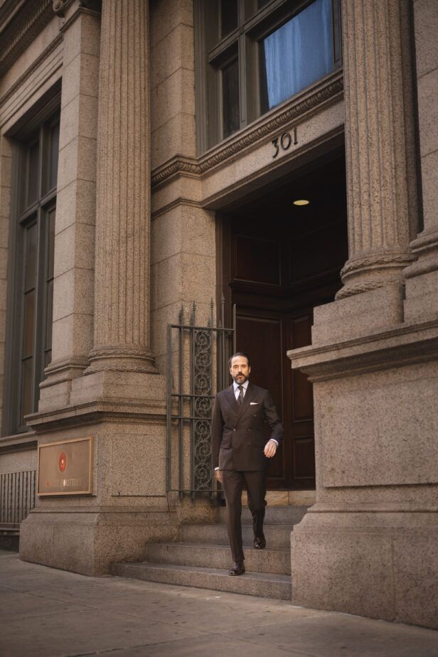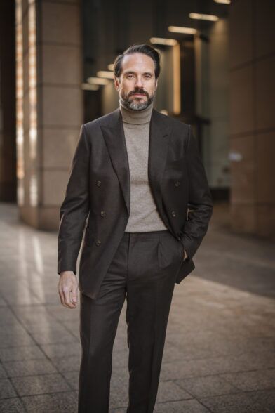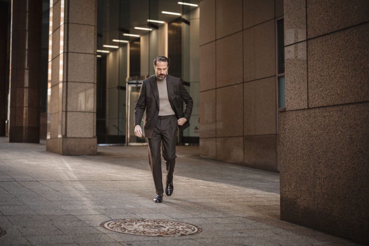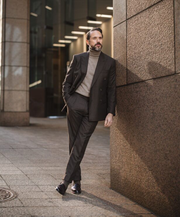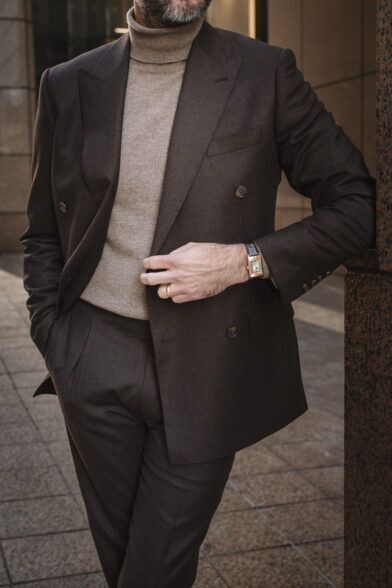 I will not wear all of my double-breasted suits in this manner, but a brown flannel double-breasted suit is, in my opinion, the perfect suit to do it with. It feels more casual. It has a warm and luxe vibe. Throw on a tan cashmere turtleneck and pair of loafers and you’ve got a look that oozes style and sophistication.