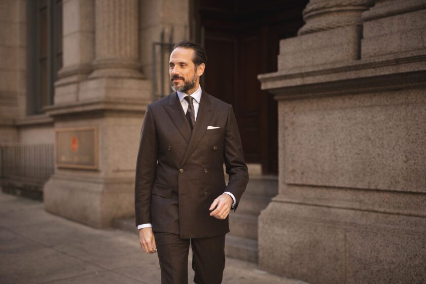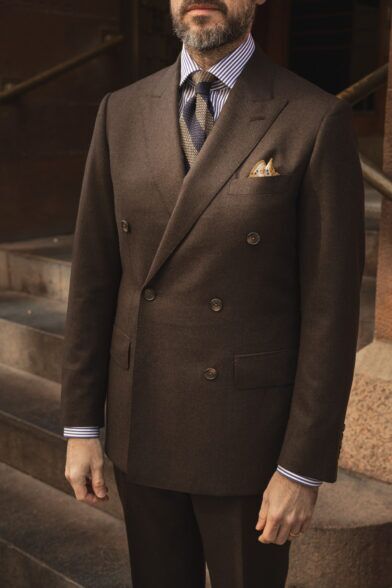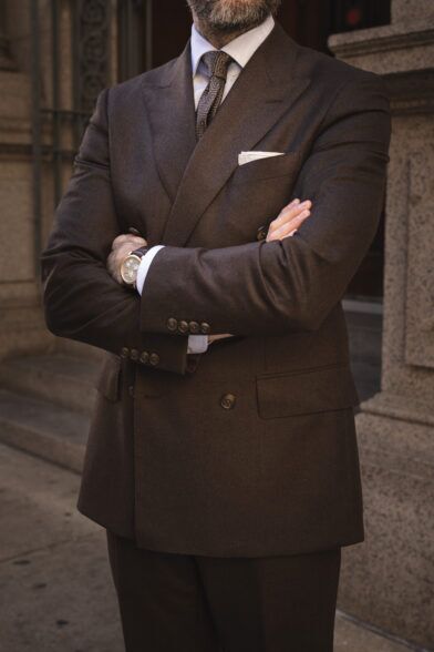 A brown double-breasted flannel suit is far from being a one-trick wonder. There are myriad ways to style it while always retaining its chic sophistication.
