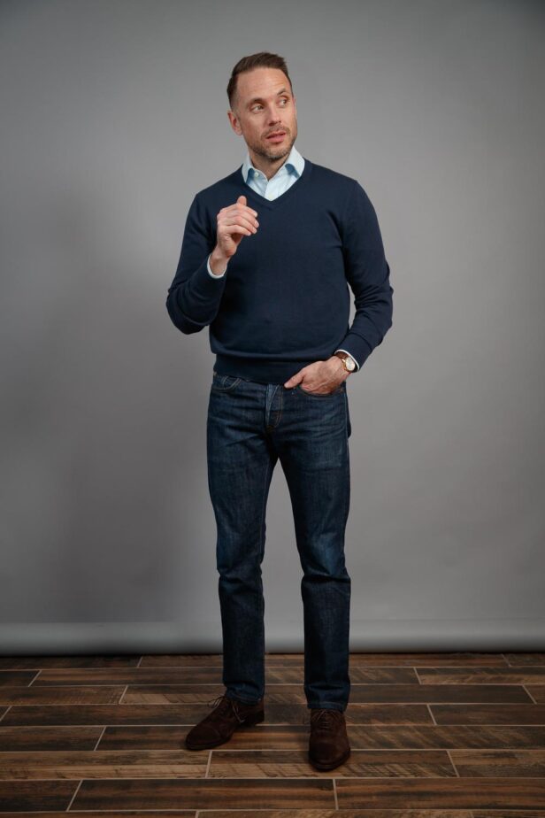 Layering pieces now. Up first is a navy v-neck sweater. You’ll want something thinner and in a lighter weight fabric like merino wool, as it’s easy to slip under a jacket for proper layering. And, the v-neck helps a collared shirt-with or without a tie-to sit a little better.