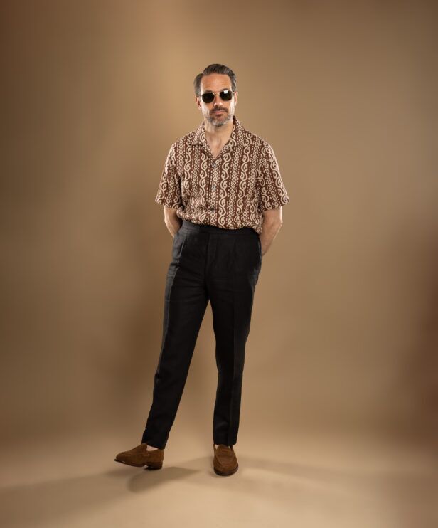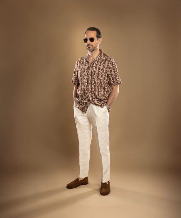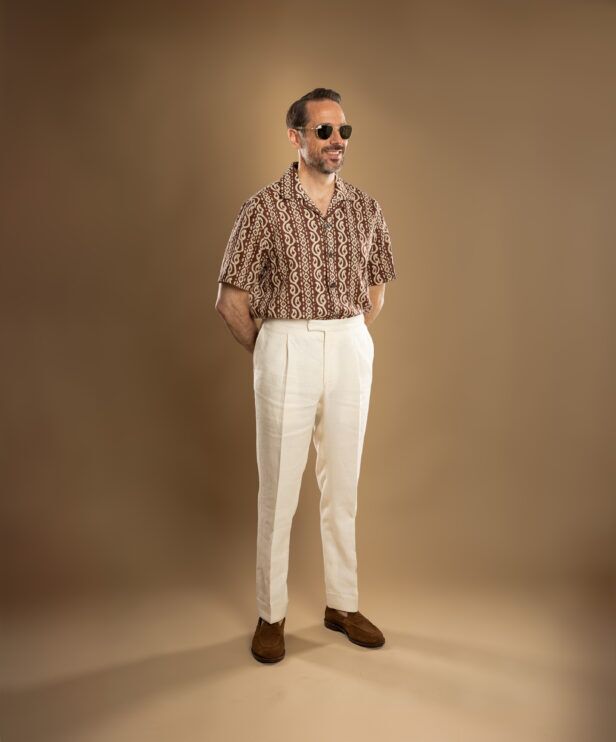 Look number four, I’m going without a jacket — just the printed shirt with the linen trousers. Much more casual and relaxed with the slightly oversized fit being great for keeping cool.