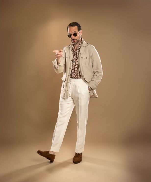 Look number three. Again, swapping the jacket out, this time for the safari jacket. Another tonal look that’s still somewhat dressy, but a little bit more of a casual and sporty vacation style because of the jacket.