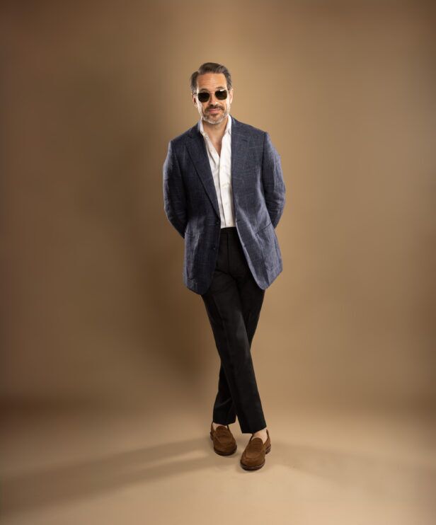 Up first is a slate blue Glen plaid sport coat. It’s 100-percent linen and half-lined, meaning it’s super light and breathable. The pattern is subtle but sporty and the patch pockets keep it casual.