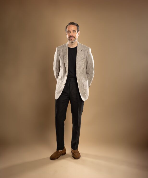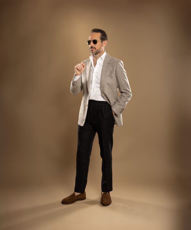 Look number 12. We’re moving into black linen trouser territory. Pairing it with the white shirt and houndstooth sport coat, which helps to tie in with the color of the bourbon suede loafers.