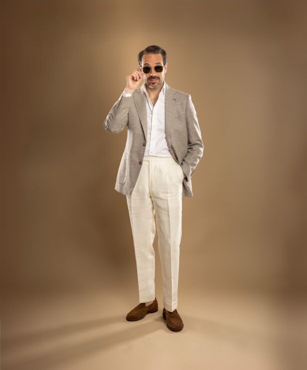 Look number one. Combining the white shirt with the cream trousers and the houndstooth sport coat. It’s tonal, minimal, little bit of visual interest via the houndstooth pattern.
