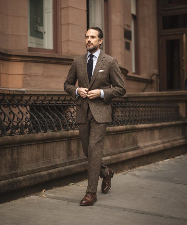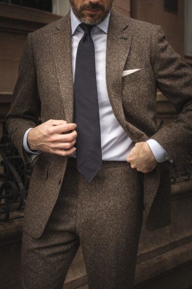 If you’re looking to deepen your fall and winter wardrobe bench, there is no better choice than a dark brown Donegal tweed suit. Its durability makes it a sound investment that you’ll be able to enjoy for years and years to come. Its warmth makes it an incredibly practical choice for the colder months. The fabric’s unique appearance makes each and every suit a one-of-a-kind garment. It’s exceptionally versatile — you’ve got a full suit, sport coat, and trousers. And you have a connection to hundreds of years of heritage, history, and craftsmanship.