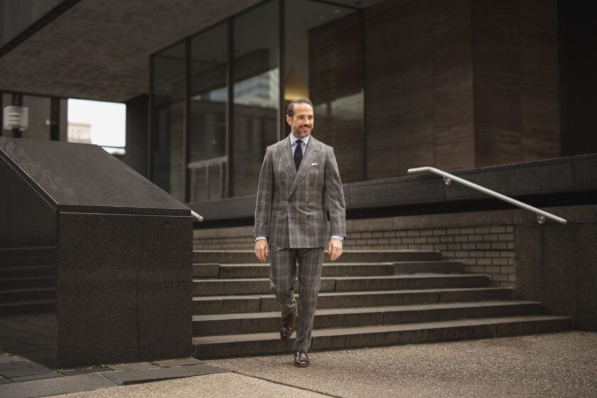 Focusing on the fit of the garment may be pretty self-evident since it’s something that applies to literally any outfit you may put together. But in the case of a statement suit, it’s even more important. By its sheer nature, a statement suit — like the gray double-breasted plaid flannel suit I’m wearing here — is going to call attention to itself. People are going to look and possibly stare. There’s no way around it. So making sure it fits perfectly is of the utmost importance. If it’s too big you’ll look like a clown. Too small and you’ll look like a different kind of clown.