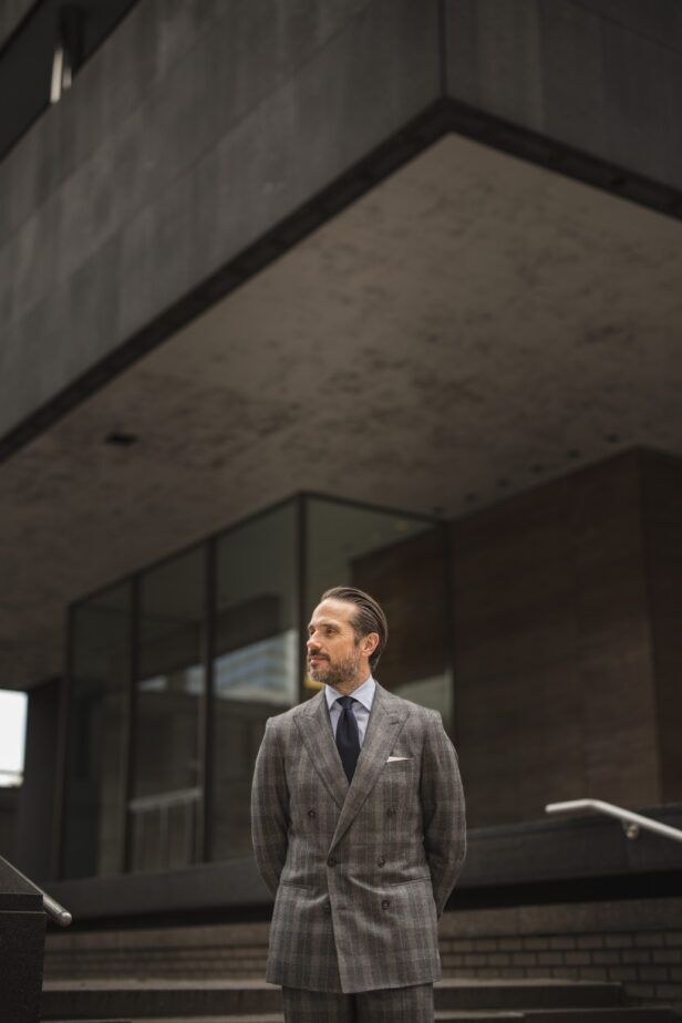 This is one of the most important principles to adhere to when styling any statement suit. You should always let the suit be the star and stand on its own. The easiest way to do that is to have the rest of the outfit stay out of its way by keeping things as simple as possible. In this case, since we’re dealing with a gray plaid double-breasted flannel suit, that means a solid shirt, solid tie, and solid pocket square. Don’t send mixed signals and muddy the waters with too much activity and let the suit take center stage.
