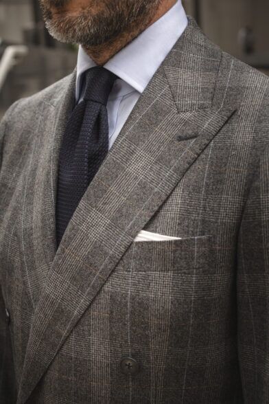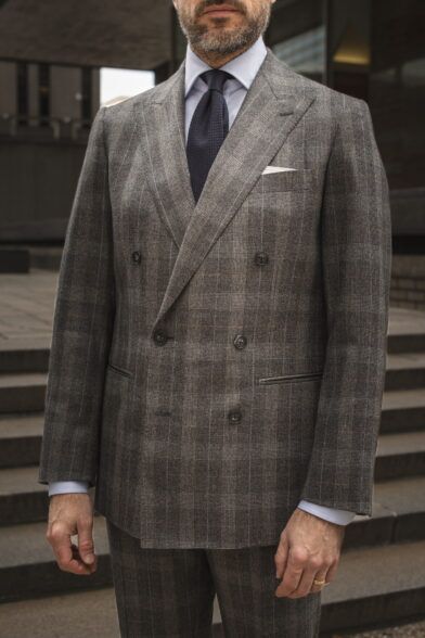 Now that we’ve talked about how to style this particular statement suit, let’s take a closer look at the suit itself. It’s brand new in the He Spoke Style Shop and it’s our gray plaid flannel double-breasted suit.