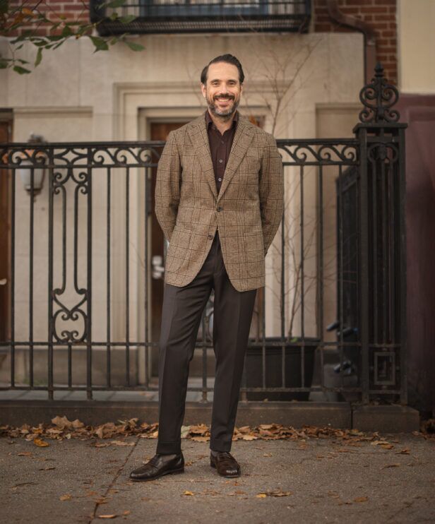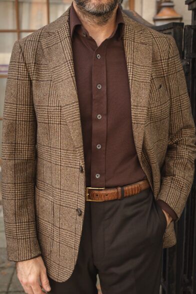 Here, we’ve got another brown tonal outfit built upon the same principles as the first look in this post—different shades of the same color, complementary fabrics, and a pattern to break things up. Same idea, completely different vibe, and a great illustration of how a couple of small tweaks can transform a look from sharp to sophisticated.