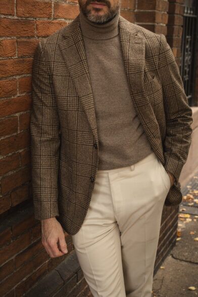 And third, add a pattern to break up the one-color monotony and keep things visually interesting. That’s where a brown Glen plaid sport coat really shines. I love how it adds a classic touch to the more modern monochromatic styling.