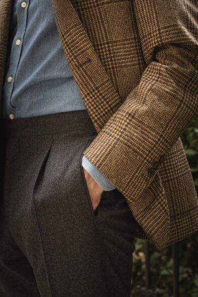Recently, however, when getting “dressed up” I find myself gravitating to a casually tailored approach with a sport coat and trousers. It’s relaxed and comfortable while still looking incredibly sharp and smart. And the sport coat that I find myself reaching for quite a bit this fall is my classic and versatile brown Glen plaid flannel sport coat.