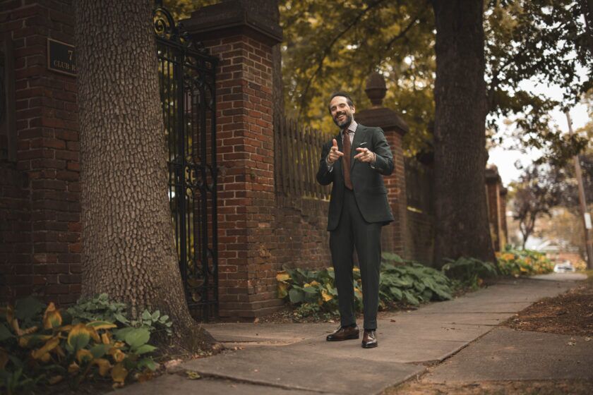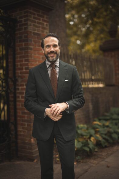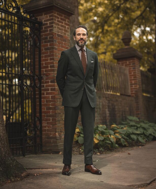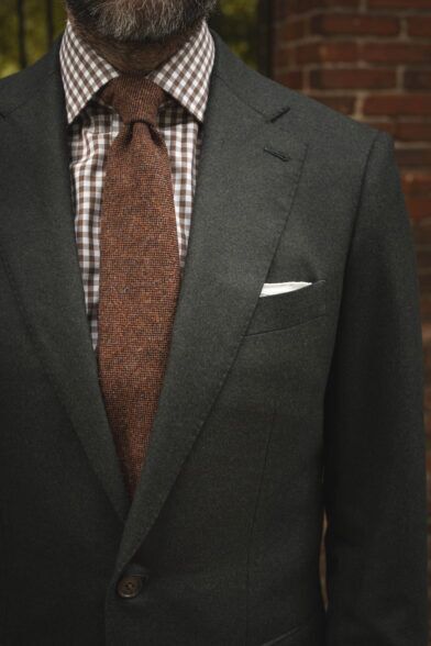 For the outfit styling, I decided to lean into the suit’s more causal nature along with the colors of the season. Our brown gingham dress shirt feels right at home paired with the forest green, lending a more casual touch. And the rust-colored necktie and brown shoes add a measure of earthiness that is definitely in keeping with a classic autumnal palette.