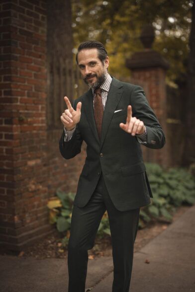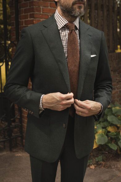 Dressing for any season is all about feel and for fall, a forest green flannel suit is one of the best garments to harness that singular autumn feeling. The color’s deep and rich hue along with the fabric’s softness, warmth, and coziness, are pretty much about as fall feeling as you can get.