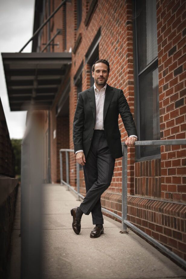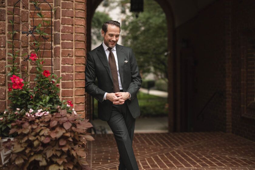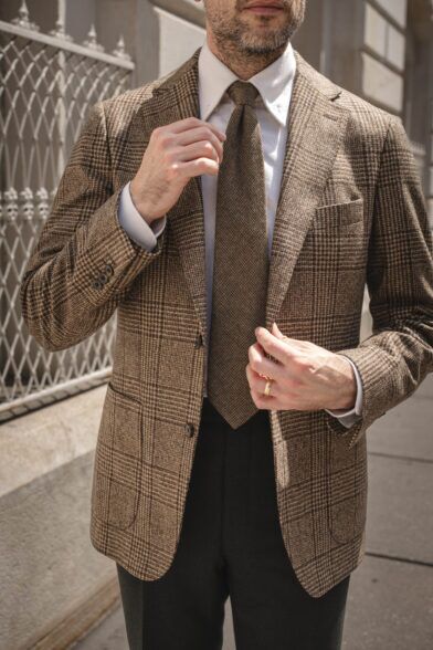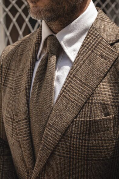 Here, I’ve chosen to lean into their earthiness with a combination—dare I call it a “triple threat”—of brown patterns and textures. Our brown Glen plaid flannel sport coat has been one of my favorites this fall. It’s classic, but distinct, and pairs perfectly with the forest green pants. I’ve combined that with a lovely and subtly-textured wool tie from the Ralph Lauren Purple Label and our cream brushed cotton button-down with the collar undone. Because, why not?