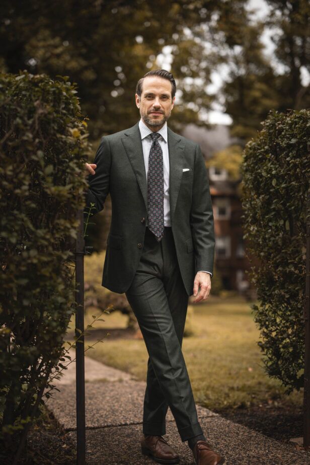 Psst. Let me tell you something. The forest green suit is in. And specifically for fall, the flannel forest green suit is in. In all honesty, there is perhaps no better color and fabric for a fall suit. Forest green is rich, deep, and lush, which helps evoke the spirit of the season and complement its colors. And the flannel fabric is soft and warm—practical and stylish.