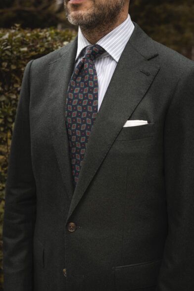 While I love the ease with which you can style a forest green flannel suit simply and classically, I think it really shines as a platform to indulge your more sartorial leanings. The combination of its unique color and more casual nature is makes it uniquely suited—sorry, not sorry, for the pun—to explore some more distinctive combinations, play around, and have a little fun.