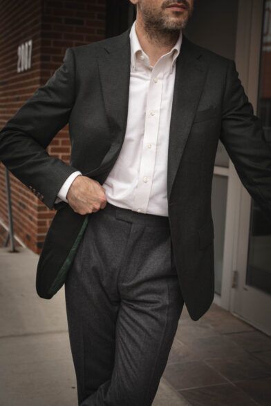 One of the biggest benefits of any flannel suit in my book is that—because of the fabric—it’s extremely easy to break your suit into separates. So not only do you have one of fall’s best-looking suits, but you’ve also got a killer sport coat and pair of pants. Let’s focus on the former here.