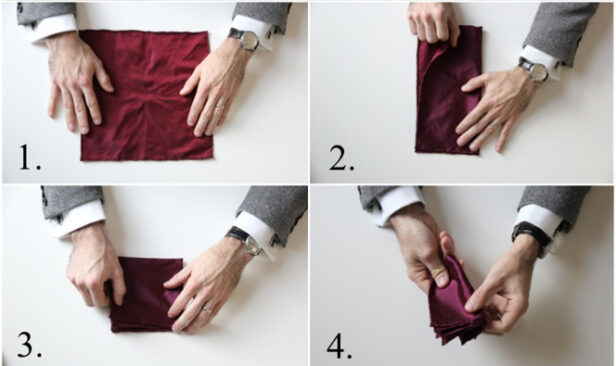 Bonus tip: If your pocket square has a tag on it you might want to carefully remove it as you definitely don’t want it showing on one of your points.