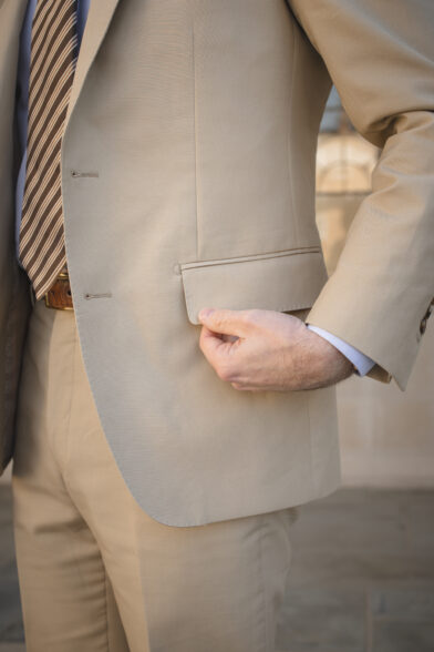 Two things to note if you’re considering a khaki cotton suit and do want to break it into separates. As the jacket alone is more casual, I would consider styling it with patch pockets. Although I’m wearing the full suit with flap pockets here, I do have a sport coat with patch pockets. But there’s nothing saying you can’t wear it separately with flap pockets — I’ve done it.