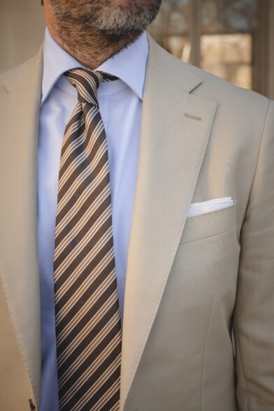 Once again, because of the khaki cotton suit’s versatility in terms of color, there aren’t really any “bad” options for the common question of what tie goes with a khaki suit. You can play it safe with solids, be a little more preppy with stripes, or go wild with a bold pattern. It’s completely up to you!