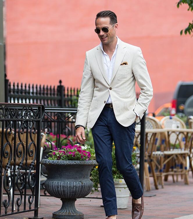 Spicing up a classic navy suit requires creativity and subtlety. A shirt collar can completely transform a suit’s presentation. The shirt I’m wearing is technically a tuxedo shirt, but worn open it’s an unexpectedly fresh and stylish option.
