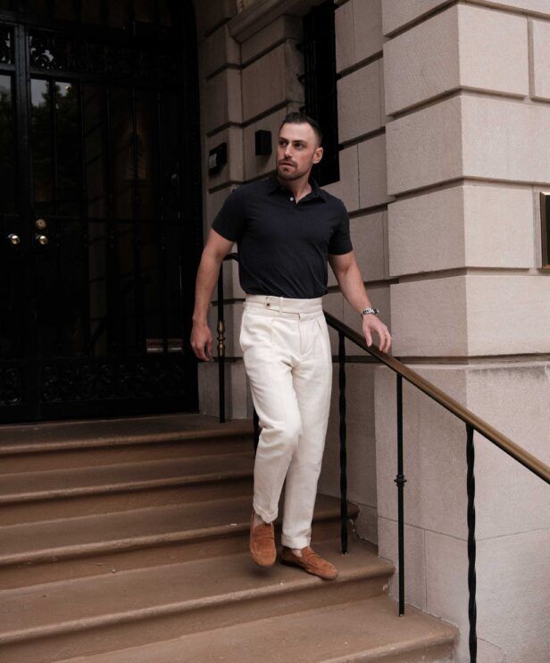 Colors are available in navy, white, charcoal, and a kind of washed black. I’ve styled the navy as a play on the ‘tee and trousers’ look making the rounds across social media channels. Solid polo. Statement trousers. Killer loafers. And a do-it-all watch.