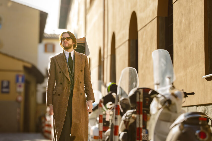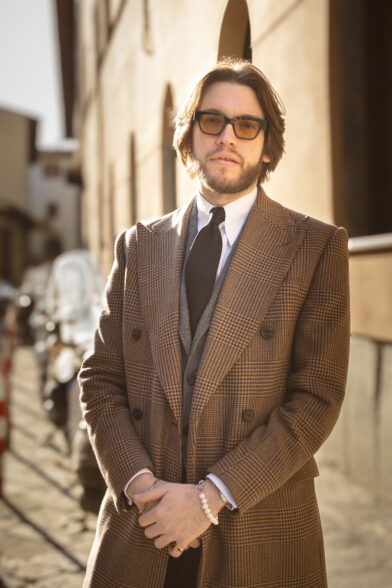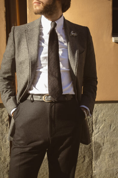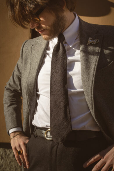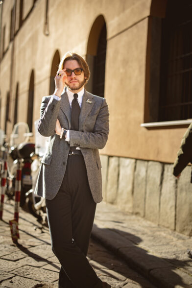 Underneath the coat, I’ve paired a grey herringbone three-button jacket and black trousers, both from the Fox Brothers flannel bunch, my preferred flannel. The shirt features my favorite Zee Jerman tab collar, a design by Max from Maximilian Mogg that has become a staple for both myself and our customers. Alongside the shirt, I’m wearing my favorite tie, a black shantung, which I find exceptionally cool due to the subtle imbalance provided by the shantung texture. My glasses are from NIRVAN JAVAN in Switzerland, my home country, and my shoes are from Atelier Leonard Khalcke in Frankfurt.