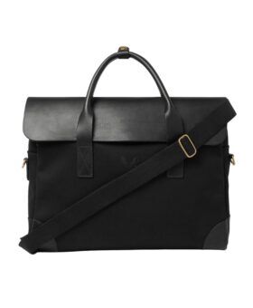 It’s constructed from waterproof cotton canvas with full-grain leather trim and handles, plus solid brass hardware that speaks to its premium build quality. Despite its slim profile, it’s surprisingly spacious inside with a padded laptop sleeve that accommodates up to 16-inch laptops, three large internal pockets, and dedicated slots for pens.
