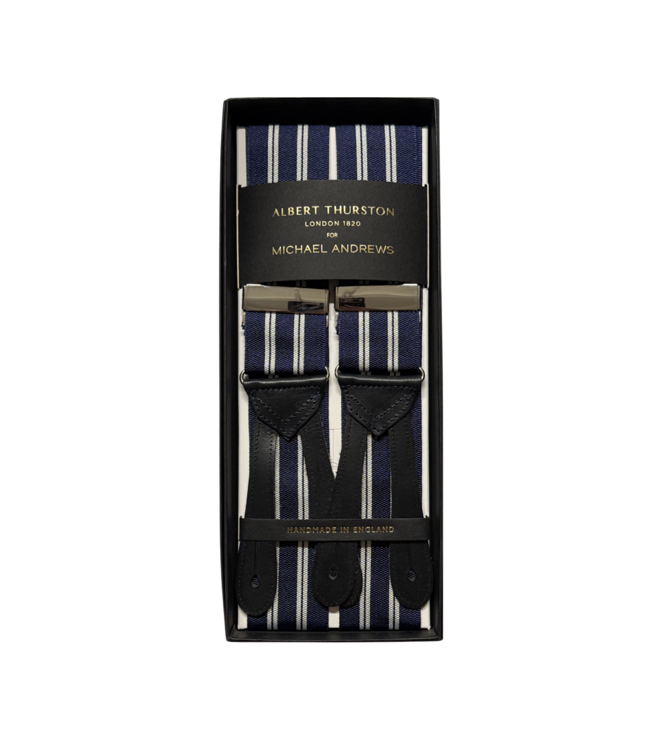 We offer a curated selection of the finest suspenders designed in collaboration with legendary maker Albert Thurston. Founded in 1820, Albert Thurston has been the world leader in superior suspenders for generations. Their braces are expertly crafted in the UK using the finest hardware and luxurious materials. This enduring quality has garnered loyalty among kings, celebrities and other men of sartorial distinction around the globe.