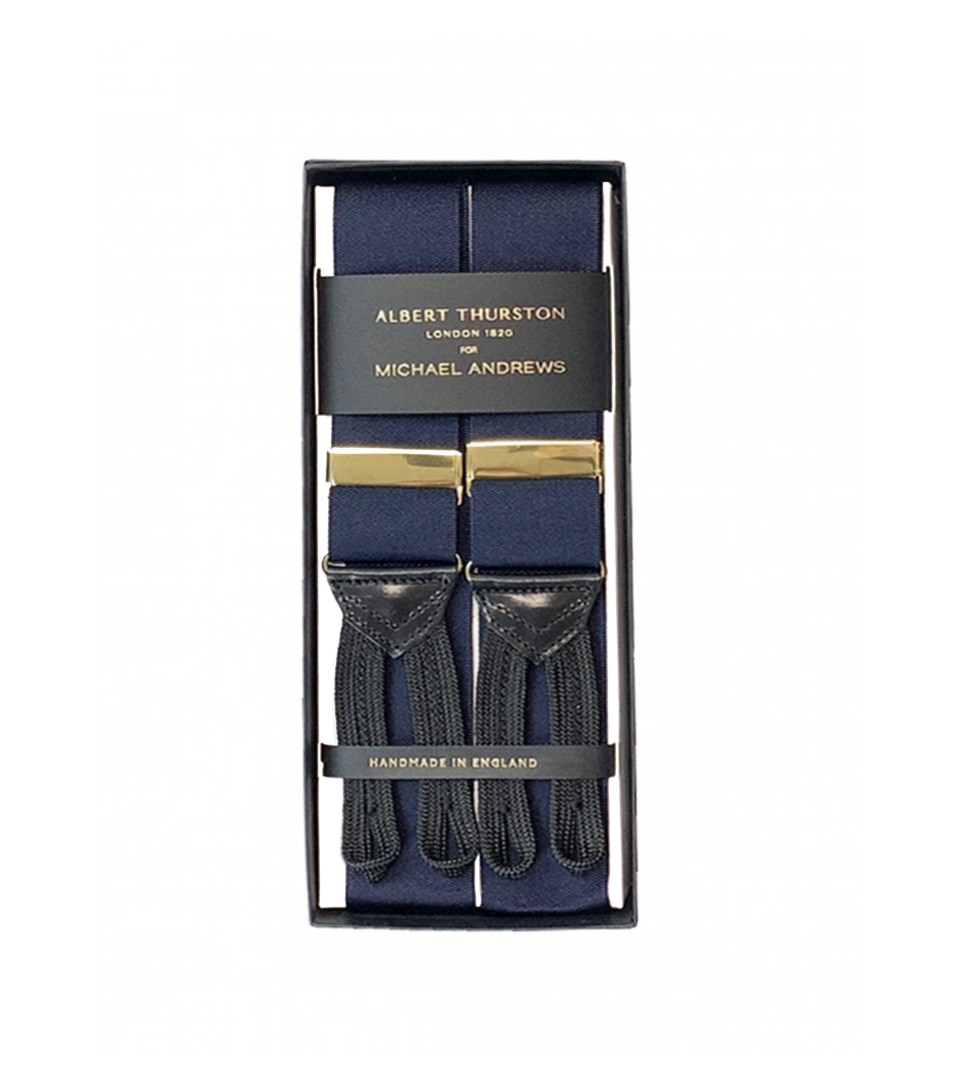 The Style GuideThese solid midnight blue suspenders with gold hardware by Albert Thurston feature woven nylon straps with braided ends. They are perfect with a tuxedo and other formalwear as well as for use on other occasions.