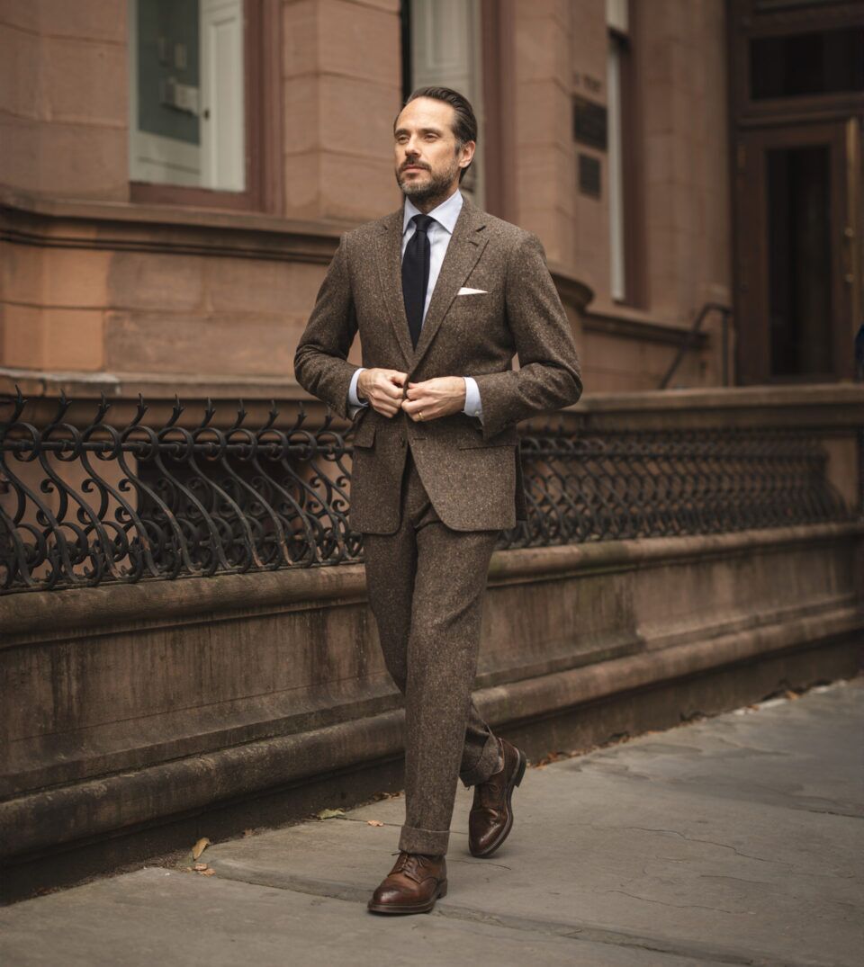 03. Dark Brown Tweed Suit With Blue Shirt And Tie
