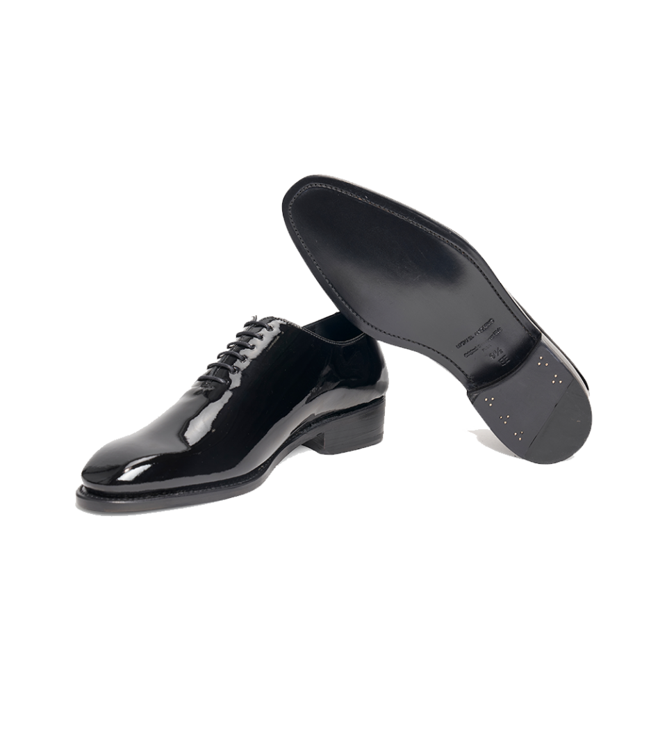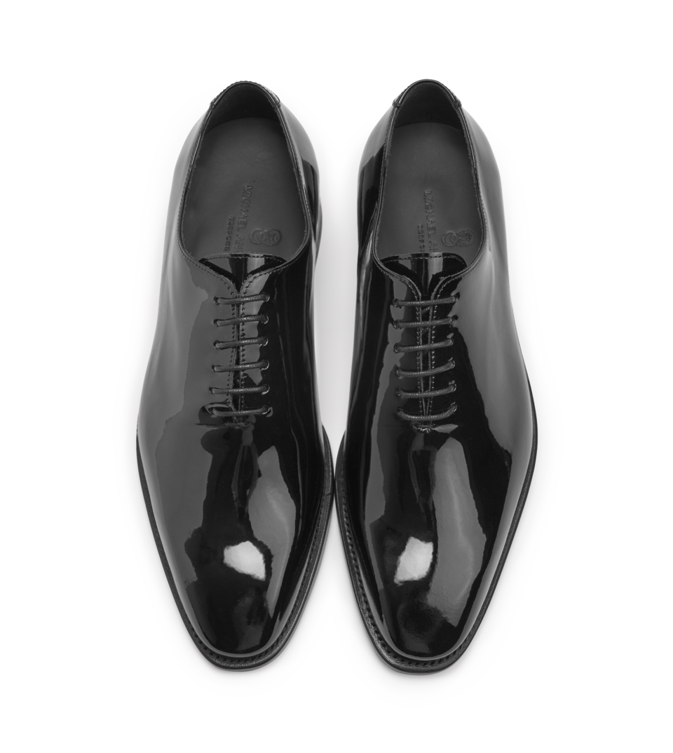The perfect lace-up patent leather tuxedo shoe for weddings or other formal affairs. Goodyear construction. Made in Spain for Michael Andrews Bespoke.