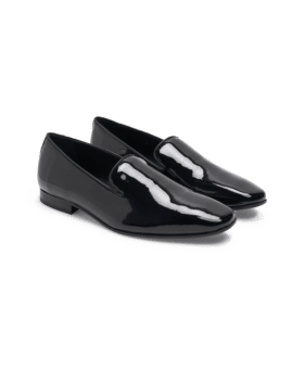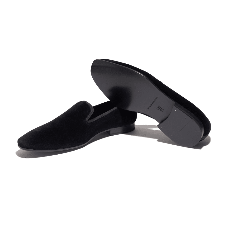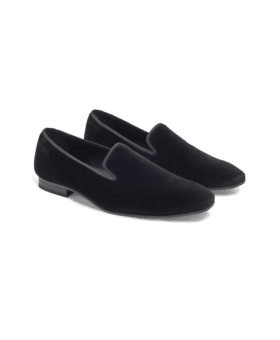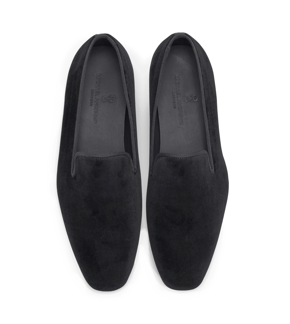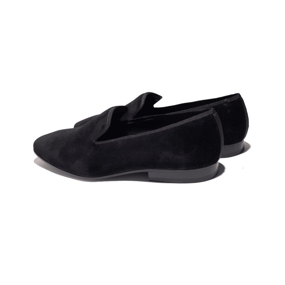 Our signature black velvet slipper is a perfect complement to wedding tuxedos but is also right at home with a pair of jeans.