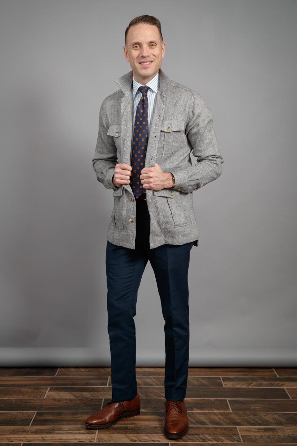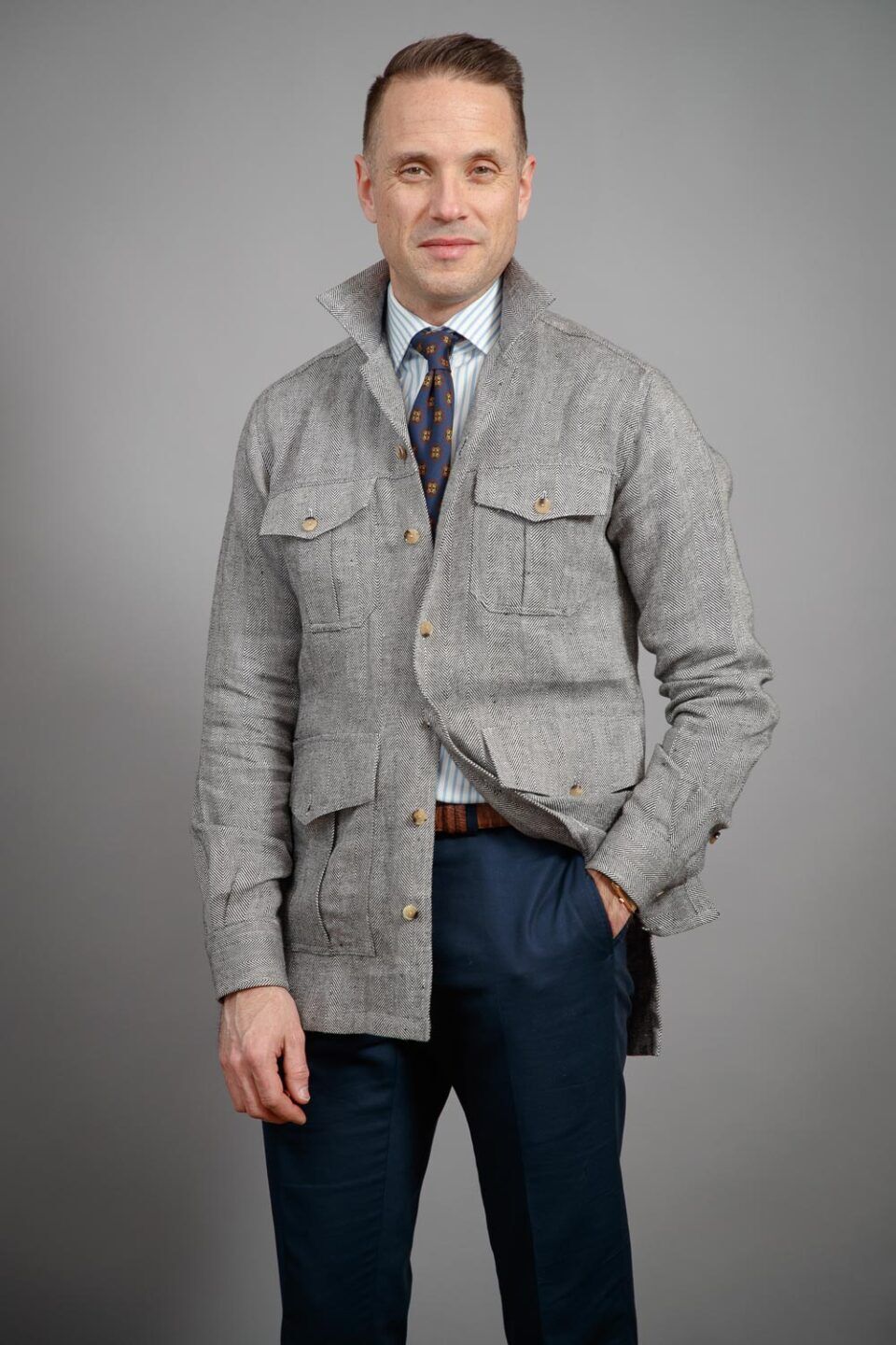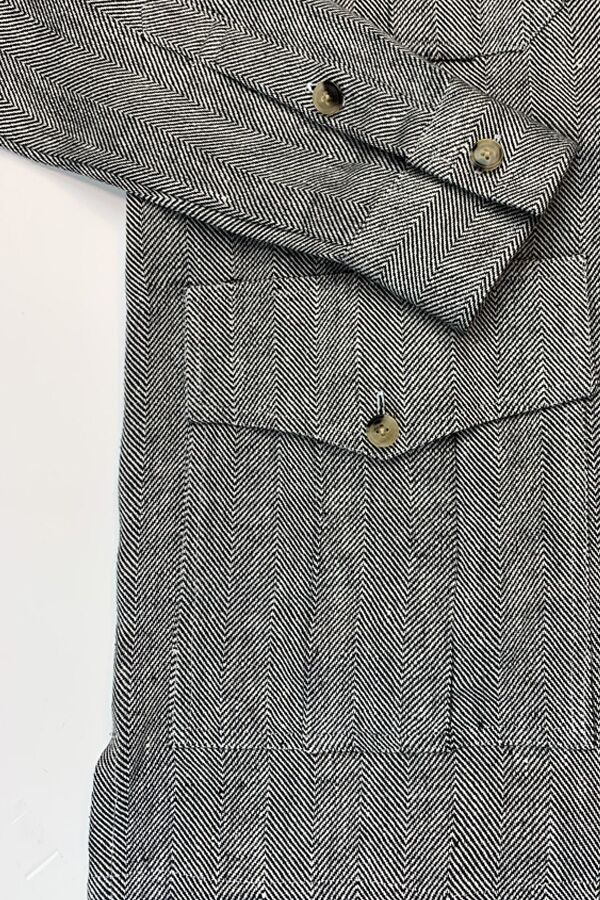 Learn MoreThe Safari Shirt Jacket (or Shacket) is an amazingly versatile transitional piece in any man’s wardrobe. Overshirts like these are perfect for those days that are too warm for a jacket but too cool for just a shirt. This particular piece is made from luxurious Irish linen milled in the UK by Ulster Weavers. The black and white herringbone design gives this shacket a more dressed up look than many of our other overshirts, but still features classic options like four large working pockets. While this may not be the first piece you pack for a big game drive, it’s perfectly at home in the urban jungle.