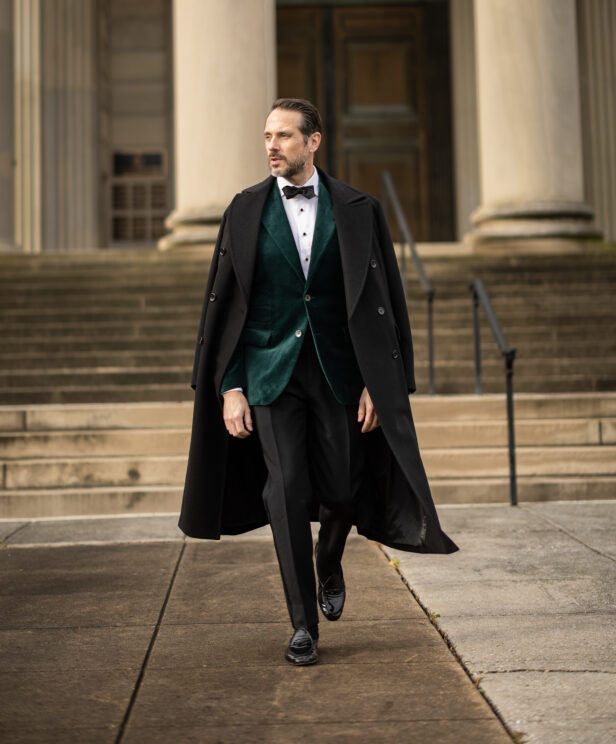 This jacket is a favorite because its rich bottle green velvet is both elegant and festive—my go-to for holiday parties.