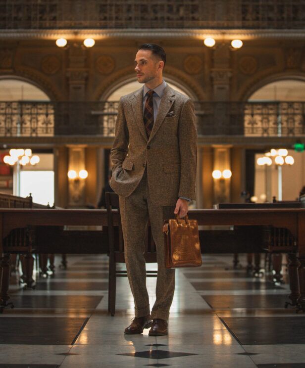 The Donegal tweed offers a rich, tactile quality that brings immediate character to the outfit. It’s my go-to for a tonal look because the fabric does all the work for you.