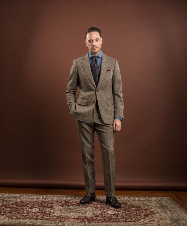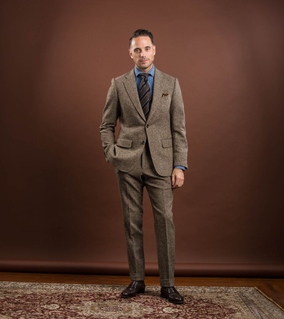 Please note this was Brian’s first custom suit ordered in 2012. Since then, have had the fabric re-milled exclusively for He Spoke Style so there will be slight variances in color between the original fabric shown and that milled a decade later. We have also removed the original elbow patches and replaced the lining with a similar brown paisley print.
