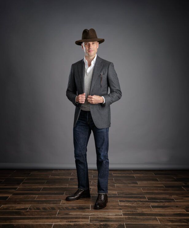 01. Charcoal Flannel Sport Coat with Jeans and Layered Sweater