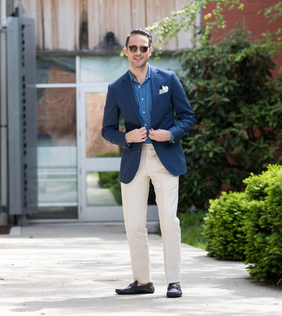 05. Navy Blazer with Denim Shirt and Cream Linen Pants