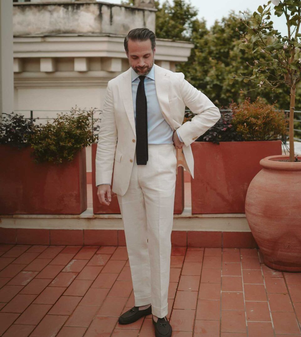 01. Cream Linen Suit With Tan Tie Summer Outfit Idea