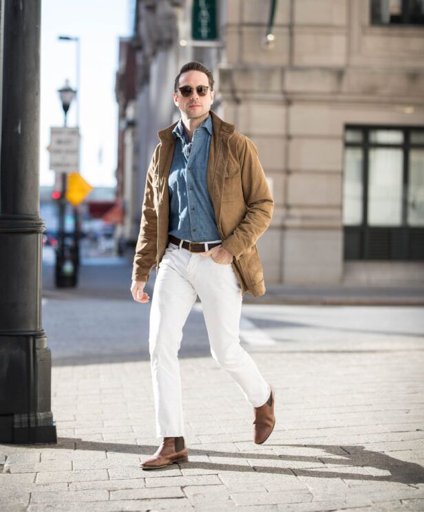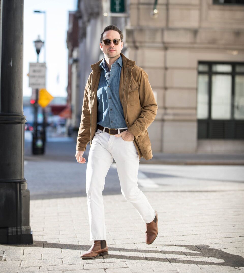 02. Denim Shirt with White Jeans and Chelsea Boots