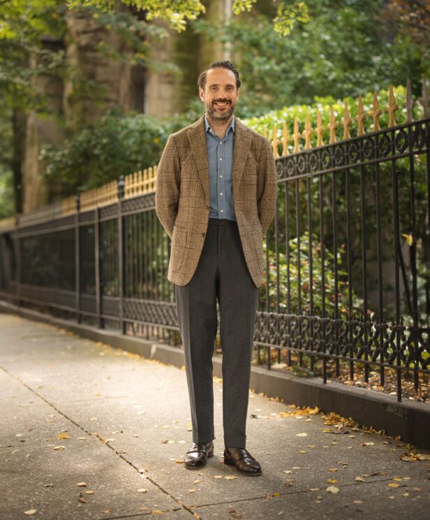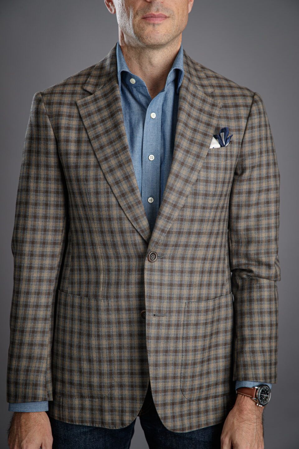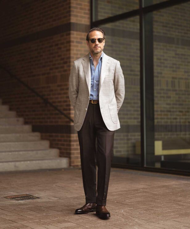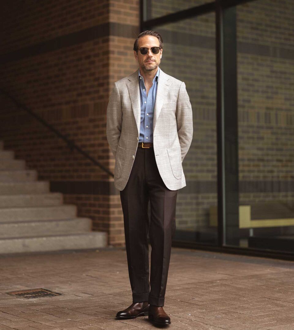 01. Glen Plaid Sport Coat with Denim Shirt and Gray Pants