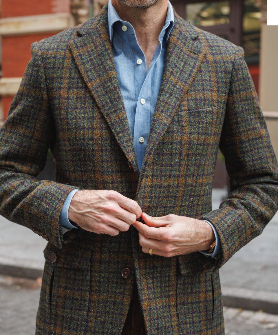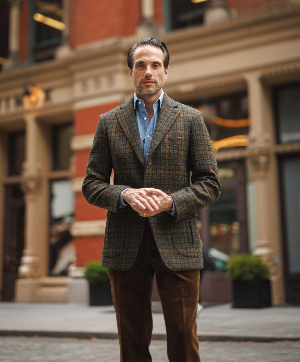 Pairs beautifully with gray flannel trousers, dark denim, or corduroy pants. The green tones work excellently with cream shirts, rich browns, and classic navy combinations.