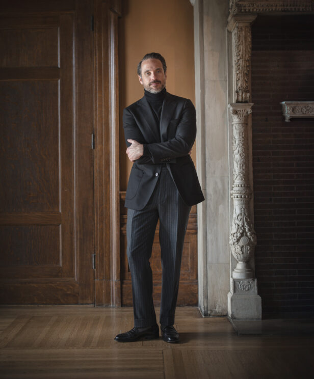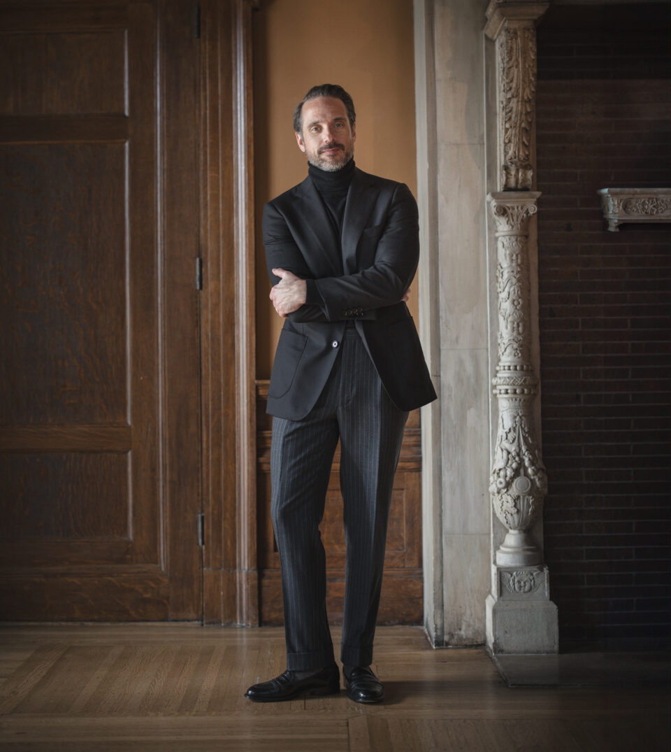 01. Black Blazer With Turtleneck and Chalk Stripe Pants