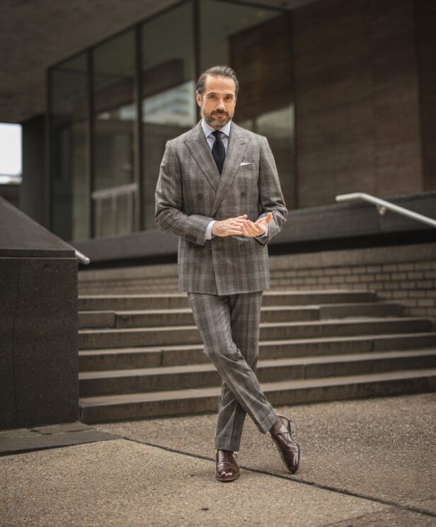 Learn MoreOur gray plaid double-breasted flannel suit is designed to make a statement. If, when you look into your wardrobe, you see a lot of solids and you feel like it’s time to branch out or if you’re simply looking for a show-stopping statement-maker, this just might be the suit for you. Pair it with a blue poplin shirt, navy grenadine tie, and dark brown Oxford shoes for some classic Italian-influenced sartorialism.