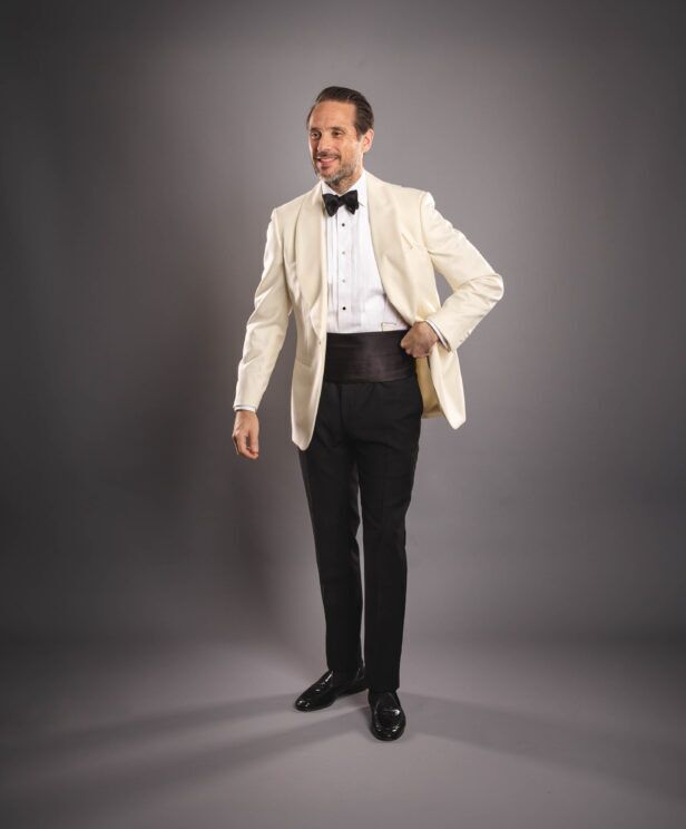 Learn MoreNo disrespect to the venerable tuxedo, but the ivory dinner jacket may just be our single favorite piece of formalwear. Pure class. Relaxed sophistication. James Bond and Bogart vibes? I mean, what else do you need? Perfect for year-round wear, our classic ivory dinner jacket is styled with a generous self-facing shawl lapel, clean jetted pockets, a single button closure (with three on the sleeve), and a modern double vent. Pair it with a fly front tuxedo shirt, classic tuxedo trousers, a satin bow tie and cummerbund, and patent Belgian slippers for a timeless formal look.