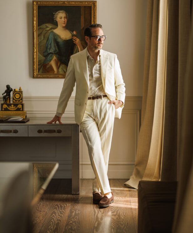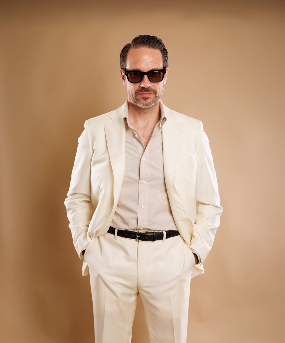 Here’s how we’d style an ivory suit for summer—tonal, textured, and with just a hint of 80s flair.